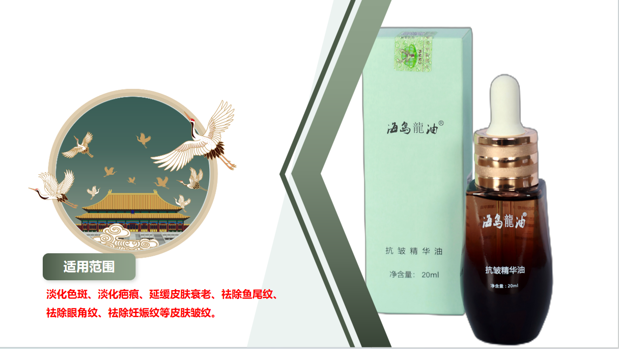 产品名称:海岛龙油 抗皱精华油产品规格:20ml产品剂型:液体油剂产品成份:30%纯蟒蛇油 (有绿色野生动物保护标识)统一零售:¥168.00许可字号:粤妆 20160172适用范围:淡化色斑、淡化疤痕、延缓皮肤衰老,祛除鱼尾纹、祛除眼角纹、祛除妊娠纹等皮肤皱纹。使用方法:1 天/3-4 次、正堂涂抹皮肤表面或患处。产品特点:30%纯蟒蛇油、无激素、无剌激或不适感、效果明显、溶解吸收快、无残留、捷带使用方便。